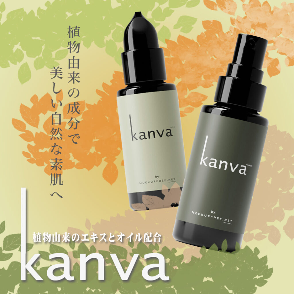 自然植物から由来する成分を配合した、新発売の美容化粧品「kanva」の公式サイトへ誘導するために制作したバナーです。制作時のキーワードを「植物」と「自然」と設定し、製品画像から想定できる配色選びから作業を始めました。キャッチコピーを縦書きの明朝体で表示させて存在感を出させ、それに伴うように商品画像を配置しています。背景の葉はPhotoshopでのブラシ機能を使用して、植物のイメージをさらに強調させています。