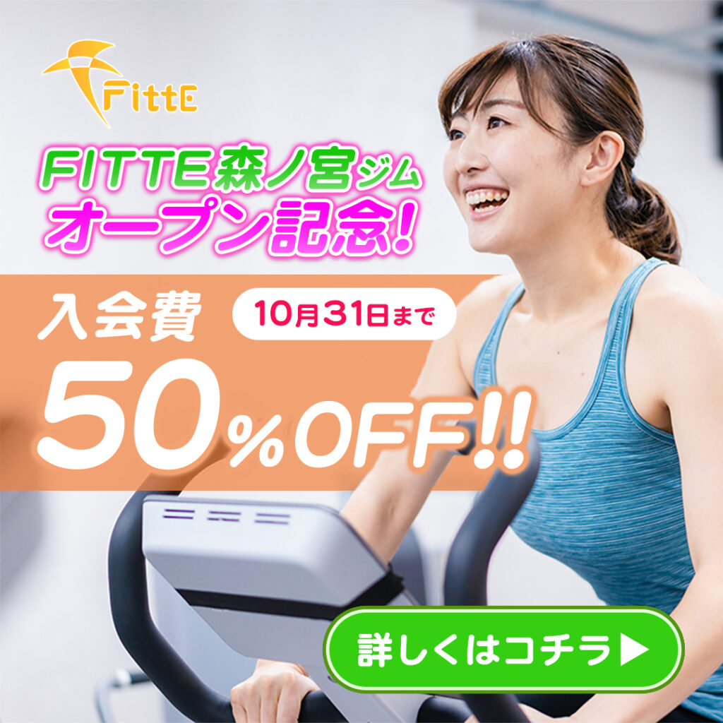 大阪で展開する架空の女性向けフィットネスジム「FITTE」の森ノ宮ジムオープンに伴うキャンペーンを紹介する広告バナーです。クライアントからいただいた女性が活き活きとジムでの運動に勤しむ画像をそのまま背景として使用し、女性の写真の周辺にテキストを配置。「森ノ宮ジムオープン」という点は導入箇所なので、中程度のフォントサイズで記載しながらも、グラデーションや光彩をつけて、もっとも訴求したい「50%OFF」の部分を邪魔させないようにバランスをとって配置しました。